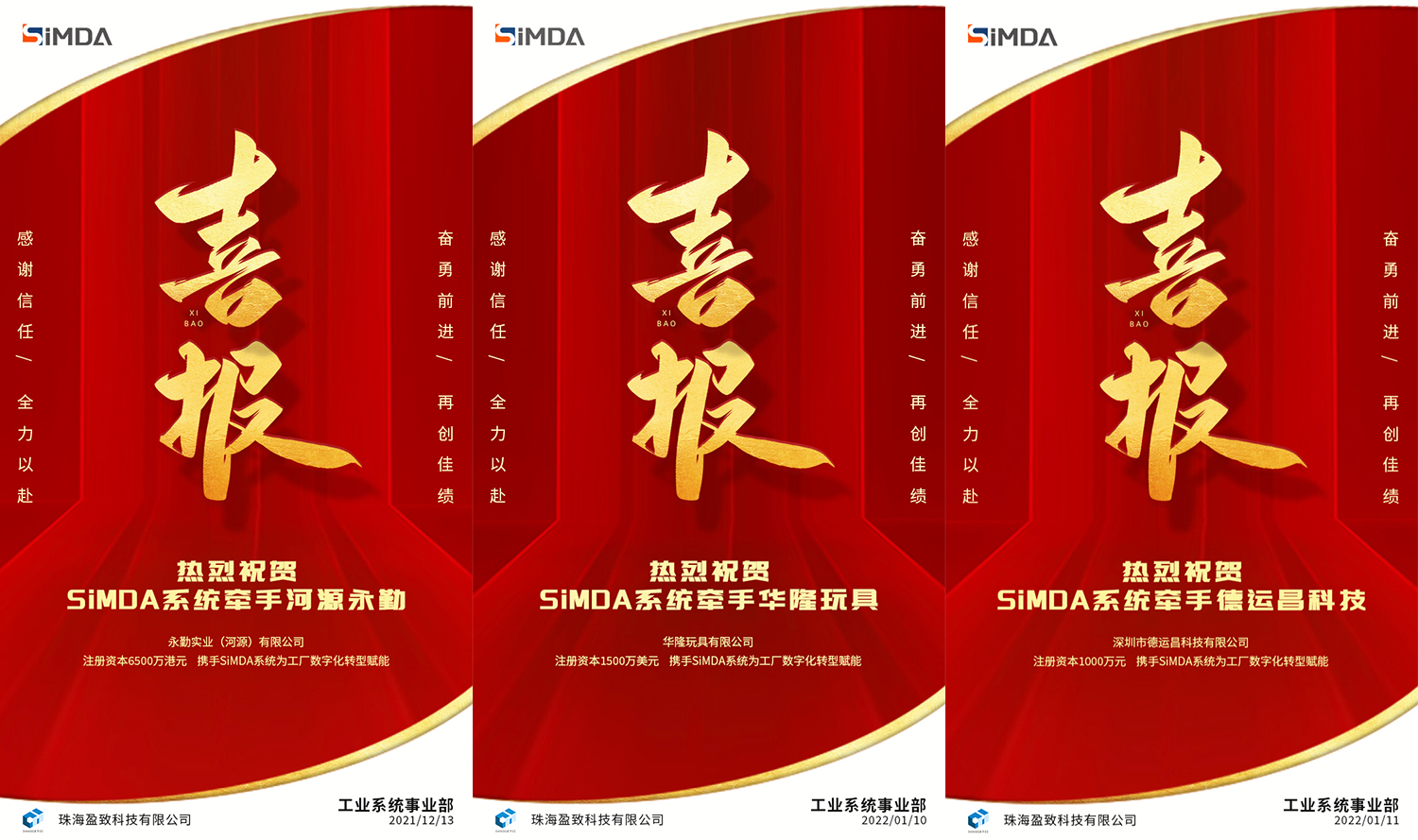 春節將至,迎來大豐收之喜。在王氏港建經銷有限公司(以下簡稱“WKK”)的全力支持下,珠海盈致科技有限公司(以下簡稱“盈致科技”)在兩個月的時間里,陸續與永勤實業(河源)有限公司、華隆玩具有限公司、深圳市德運昌科技有限公司達成合作,開啟SiMDA數字化轉型之路。