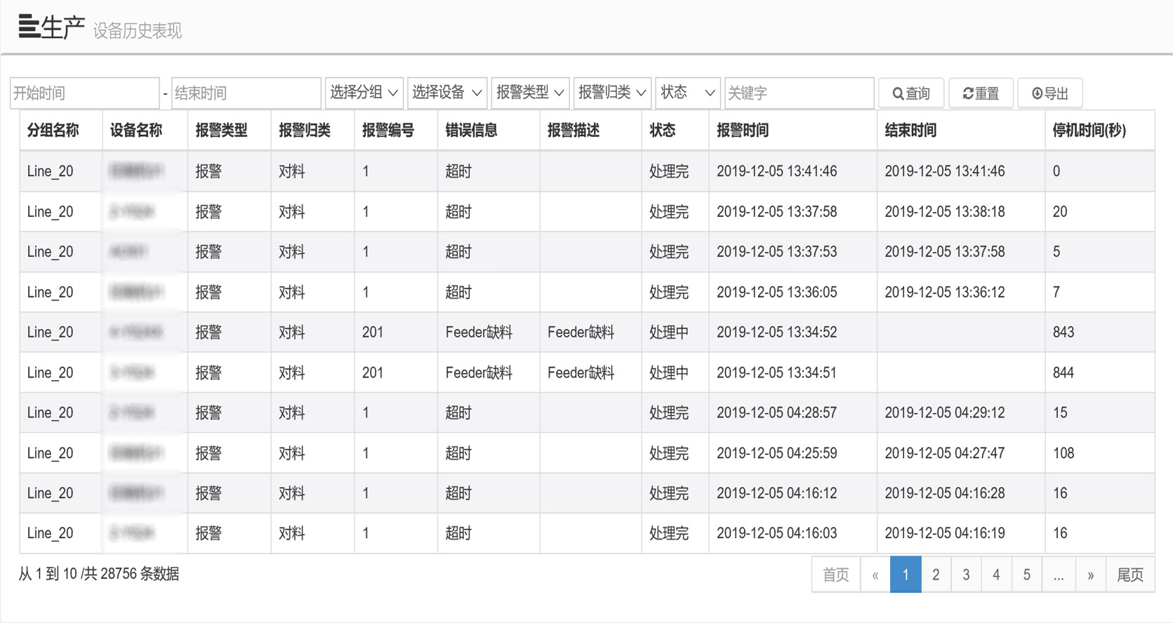 實時監控設備運行狀態,如狀態監測、運行臺時、故障停機臺時、設備異常、故障發生日期、故障維修方式、故障類型等。